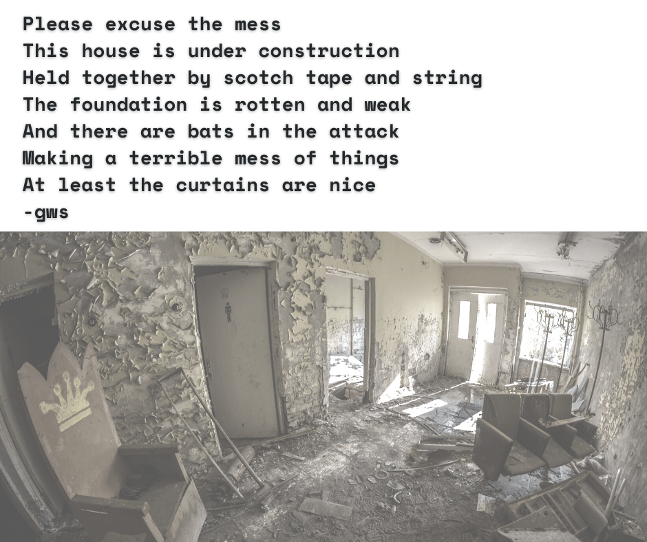 Please excuse the mess This house is under construction Held together by scotch tape and string The foundation is rotten and weak And there are bats in the attack Making a terrible mess of things At least the curtains are nice -gws