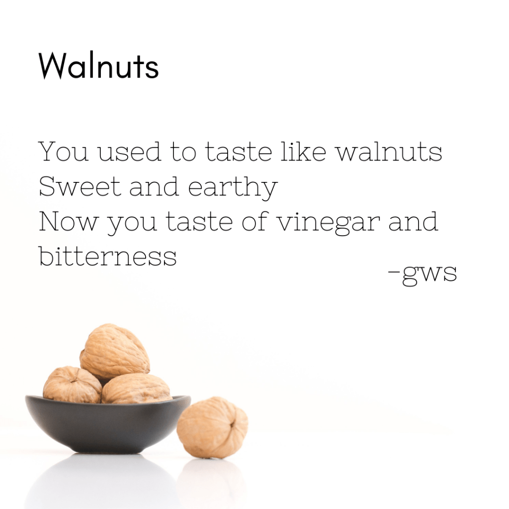 You used to taste like walnuts Sweet and earthy Now you taste of vinegar and bitterness -gws