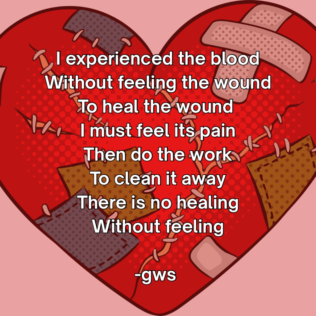 I experienced the blood without feeling Without feeling the wound To heal the wound I must feel the pain Then do the work To clean it away There is no healing Without feeling