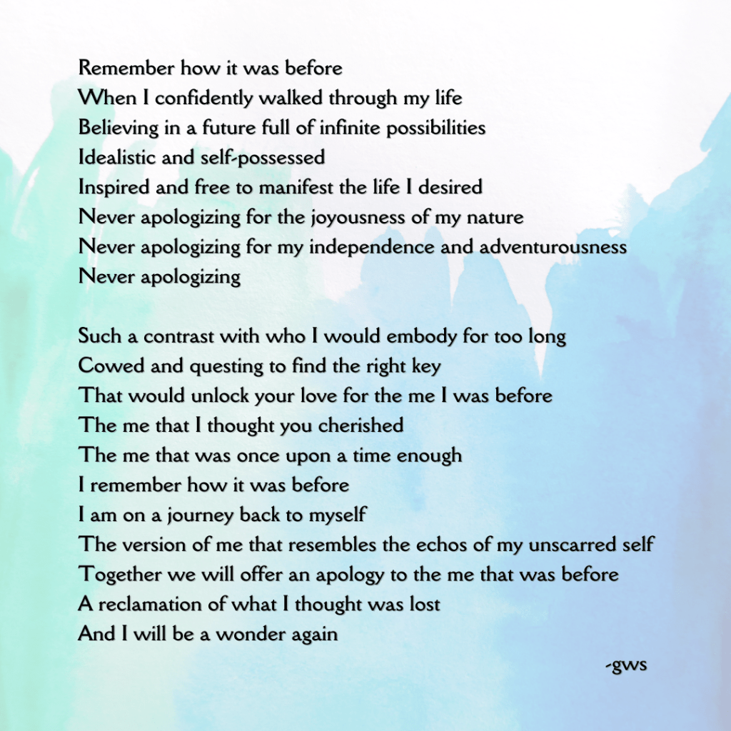 Such a contrast with who I would embody for too long Cowed and questing to find the right key That would unlock your love for the me I was before The me that I thought you cherished The me that was once upon a time enough I remember how it was before I am on a journey back to myself The version of me that resembles the echos of my unscarred self Together we will offer an apology to the me that was before A reclamation of what I thought was lost And I will be a wonder again