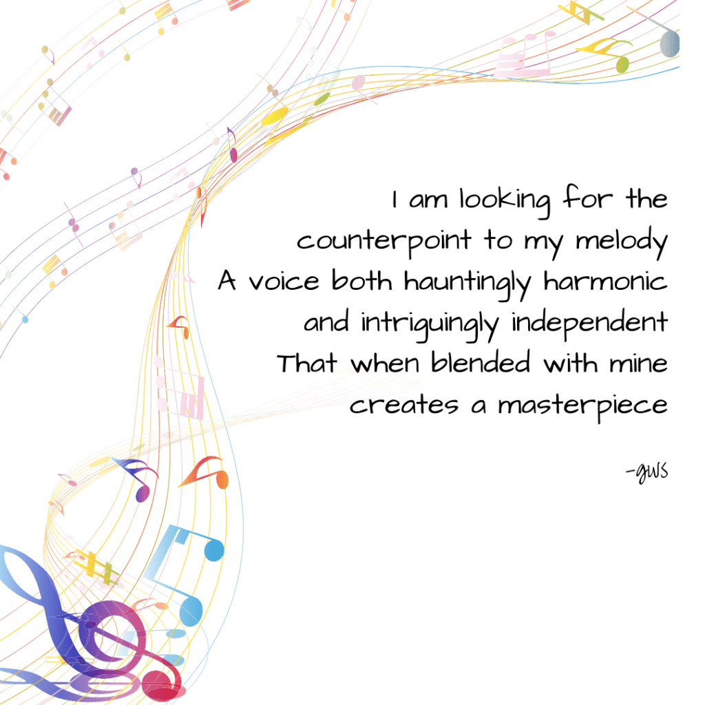I am looking for the counterpoint to my melody A voice both hauntingly harmonic and intriguingly independent That when blended with mine creates a masterpiece