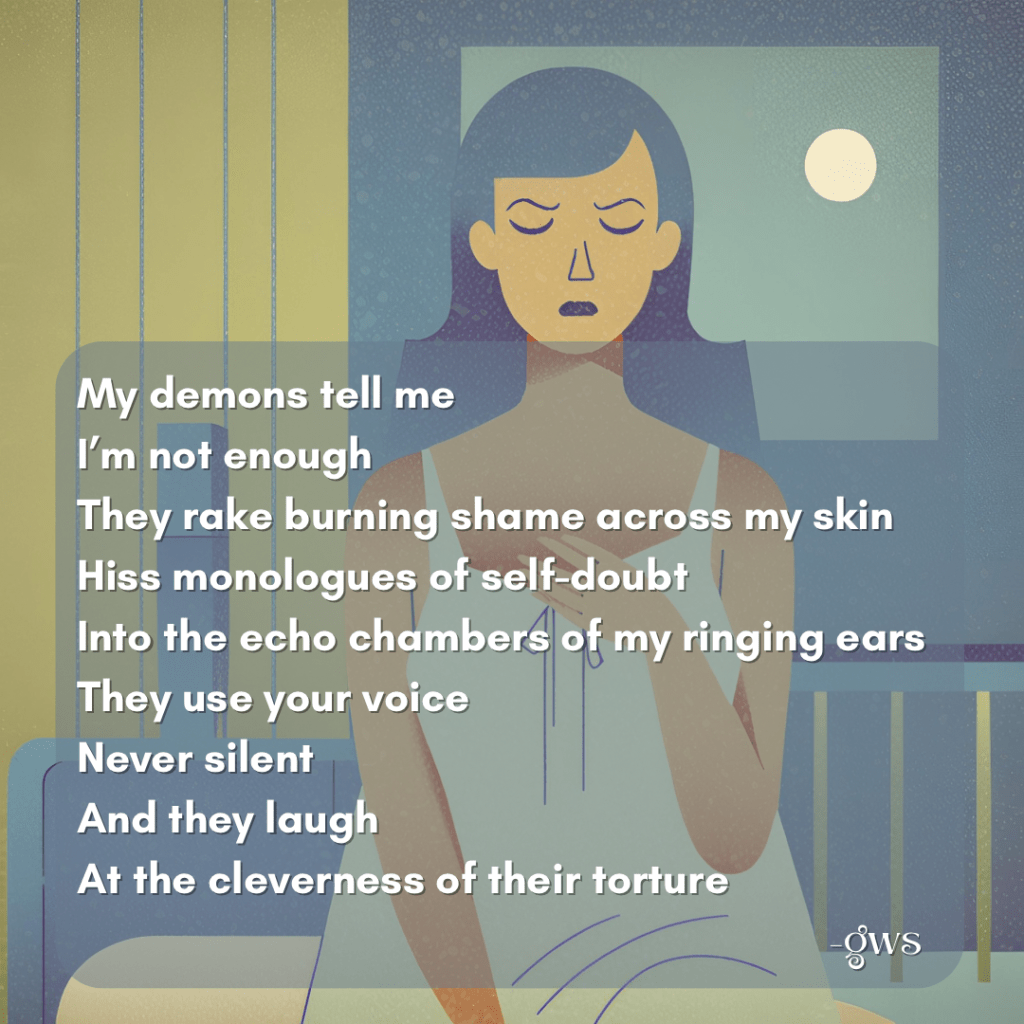 My demons tell me I’m not enough They rake burning shame across my skin Hiss monologues of self-doubt In the echo chamber of my ringing ears They use your voice Never silent And they laugh At the cleverness of their torture